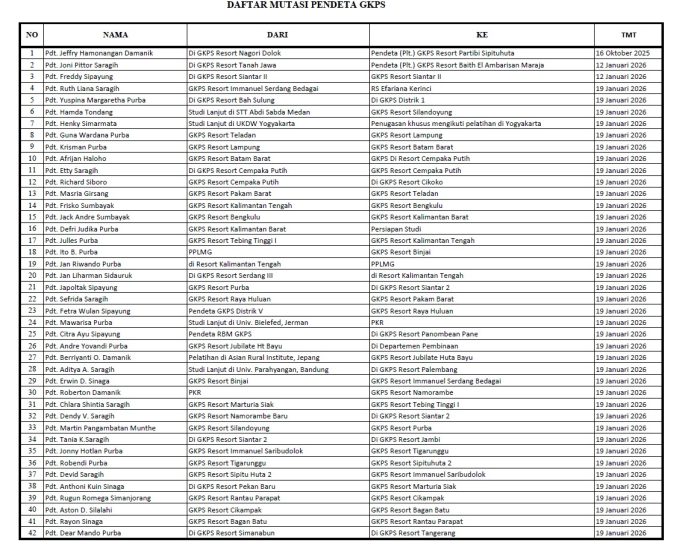 Selengkapnya daftar mutasi Pendeta GKPS:
