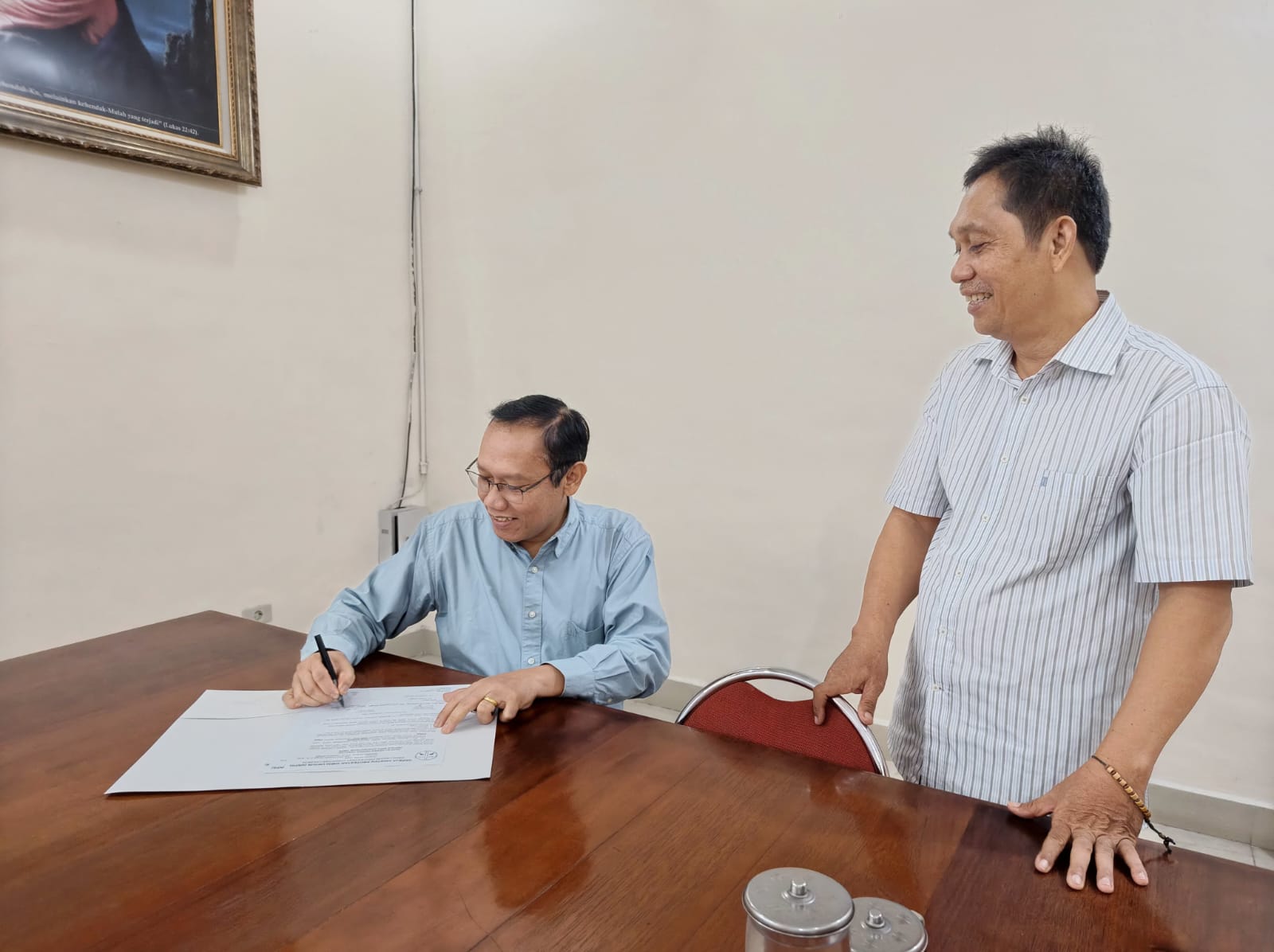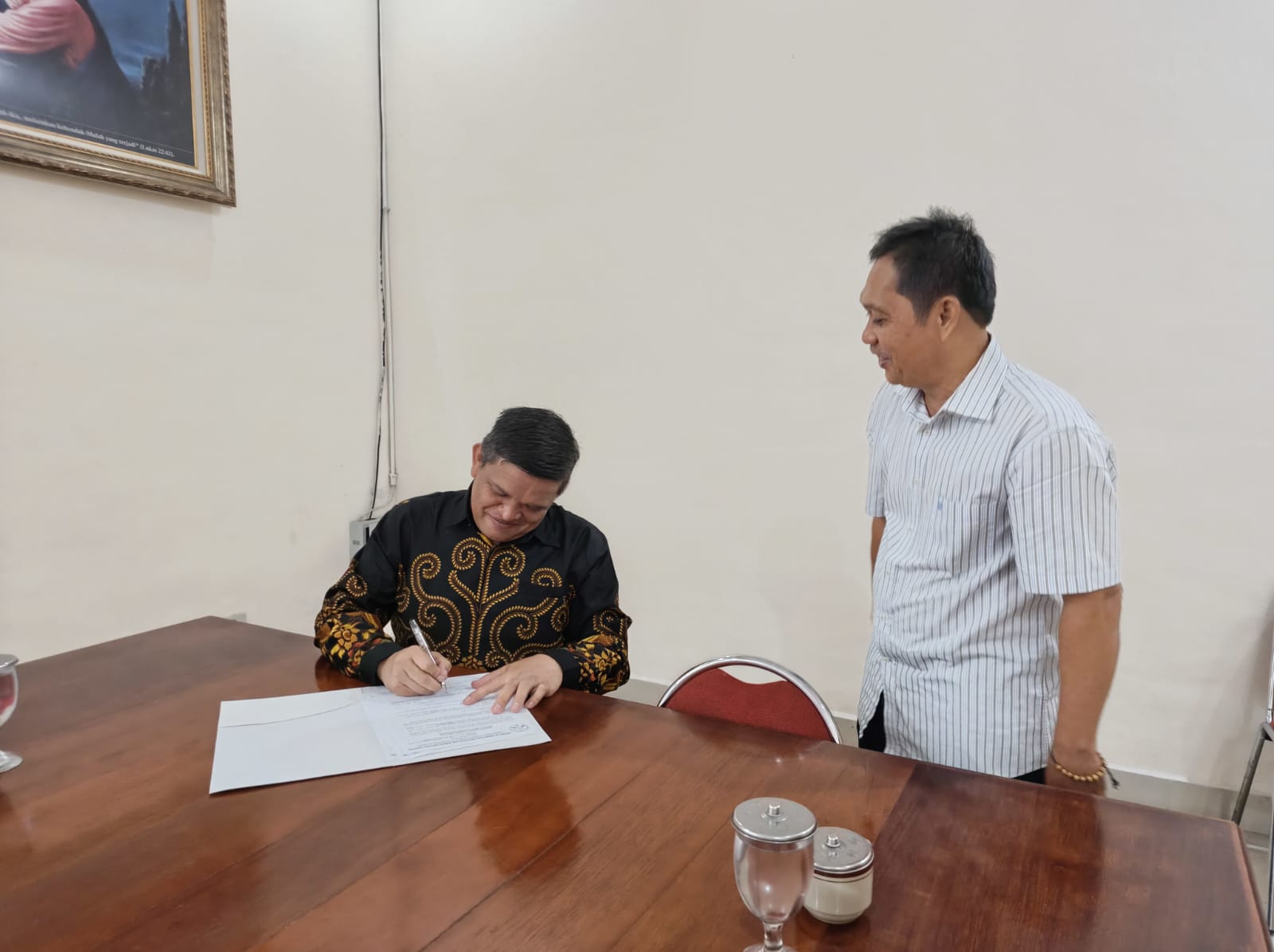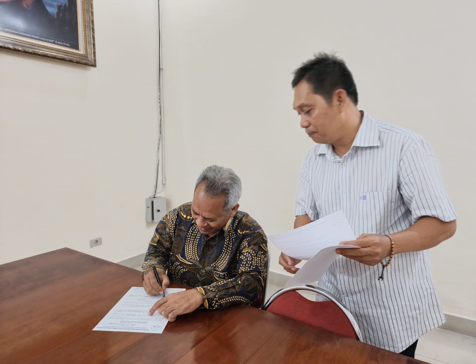 Pimpinan Sinode GKPS menerima arsip Biro Administrasi yang diserahkan Pdt. Em. Sarinus Sipayung pada Selasa (4/11/2025) siang. (Foto: Wiranata Saragih)