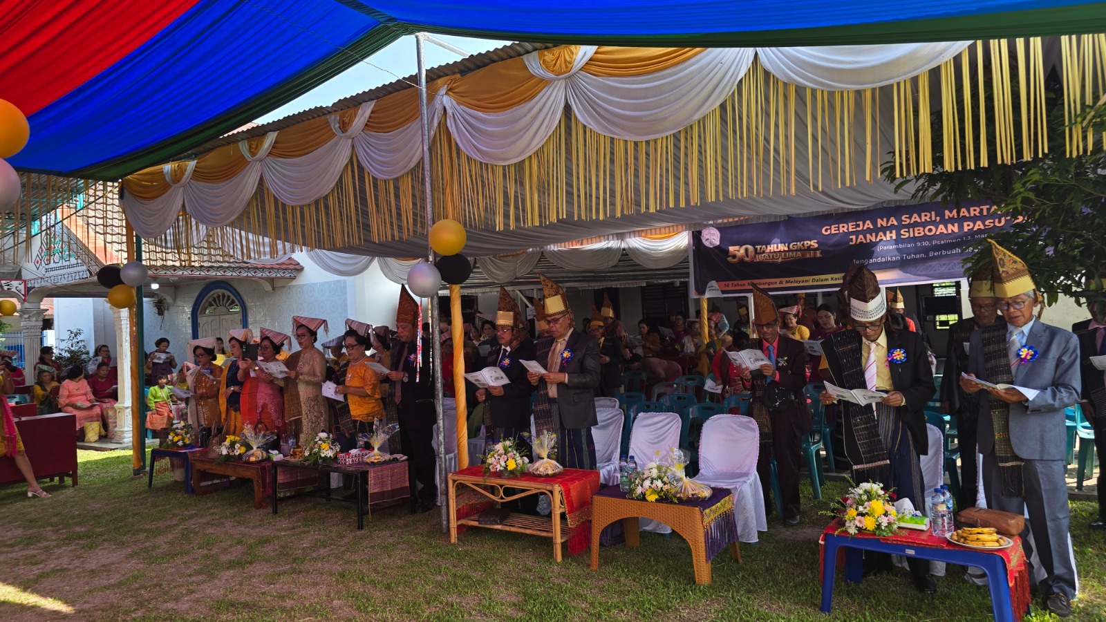 Pesta ulang tahun diawali dengan ibadah minggu bersama dipimpin Ephorus. Walau suhu panas yang cukup terik pada siang itu, ibadah berlangsung dengan khidmat, dan tak mengurangi sukacita jemaat mensyukuri berkat Tuhan yang luar biasa atas 50 tahun penyertaan-Nya.
