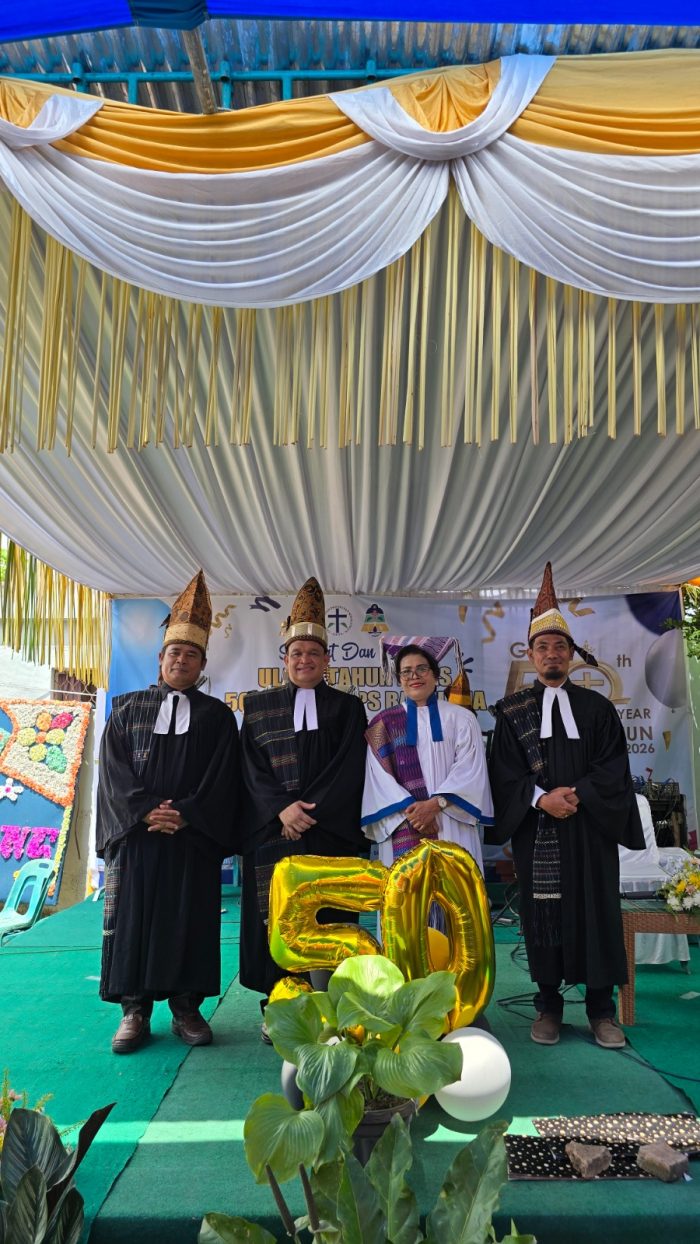 “Angka 50 tahun bukan hanya sekedar angka, tapi ini bukti bahwa dalam perjalanan gereja-Nya yang panjang, kasih Tuhan tetap menyertai, dan setiap individu di dalamnya terpanggil untuk menjadi berkat bagi dunia ini, semangat pelayanan semakin berkobar, persatuan jemaat semakin erat, dan setiap program gereja menjadi alat untuk memuliakan nama Tuhan,” pintanya. (hks/bgs)
